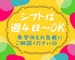 | 備考 | 【勤務日】 ・週4~5日 ・シフト制 ・土日祝固定休相談不可 ・曜日固定不可 |